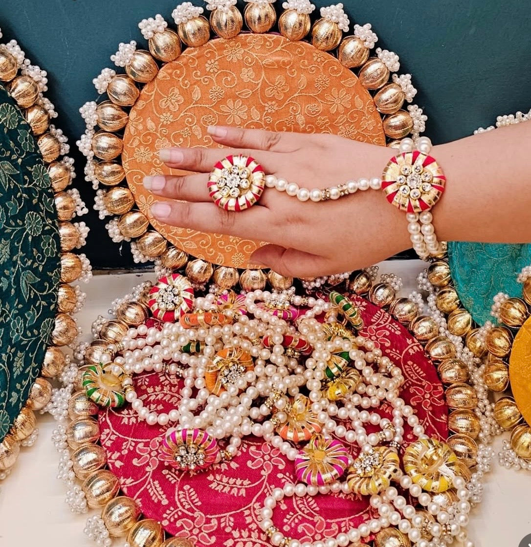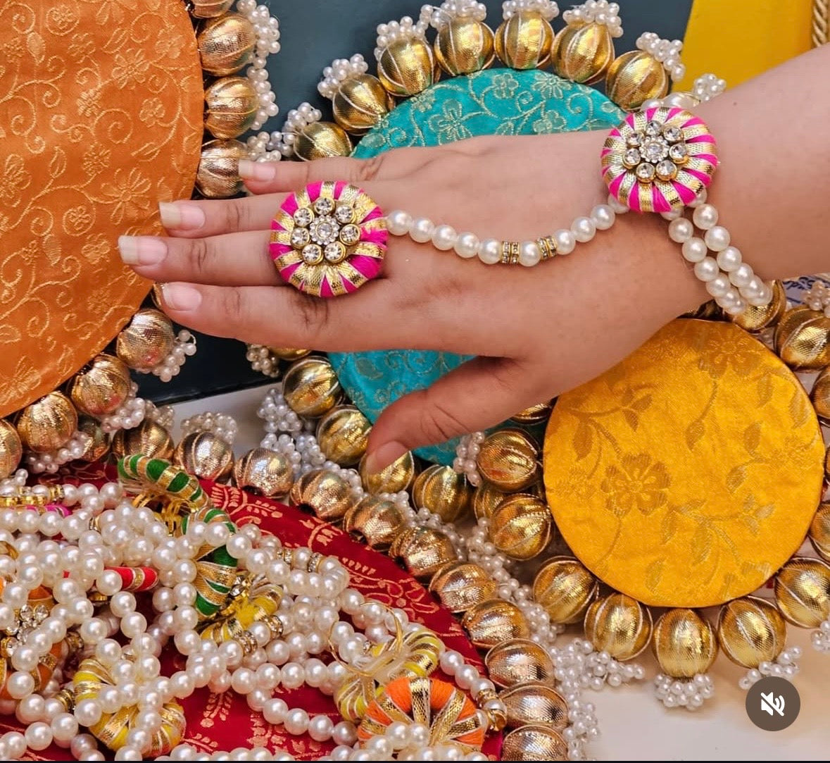 Hathphool (Hand Harness): The main piece is a stunning hand jewelry item that connects a finger ring to a bracelet via a strand of pearls.