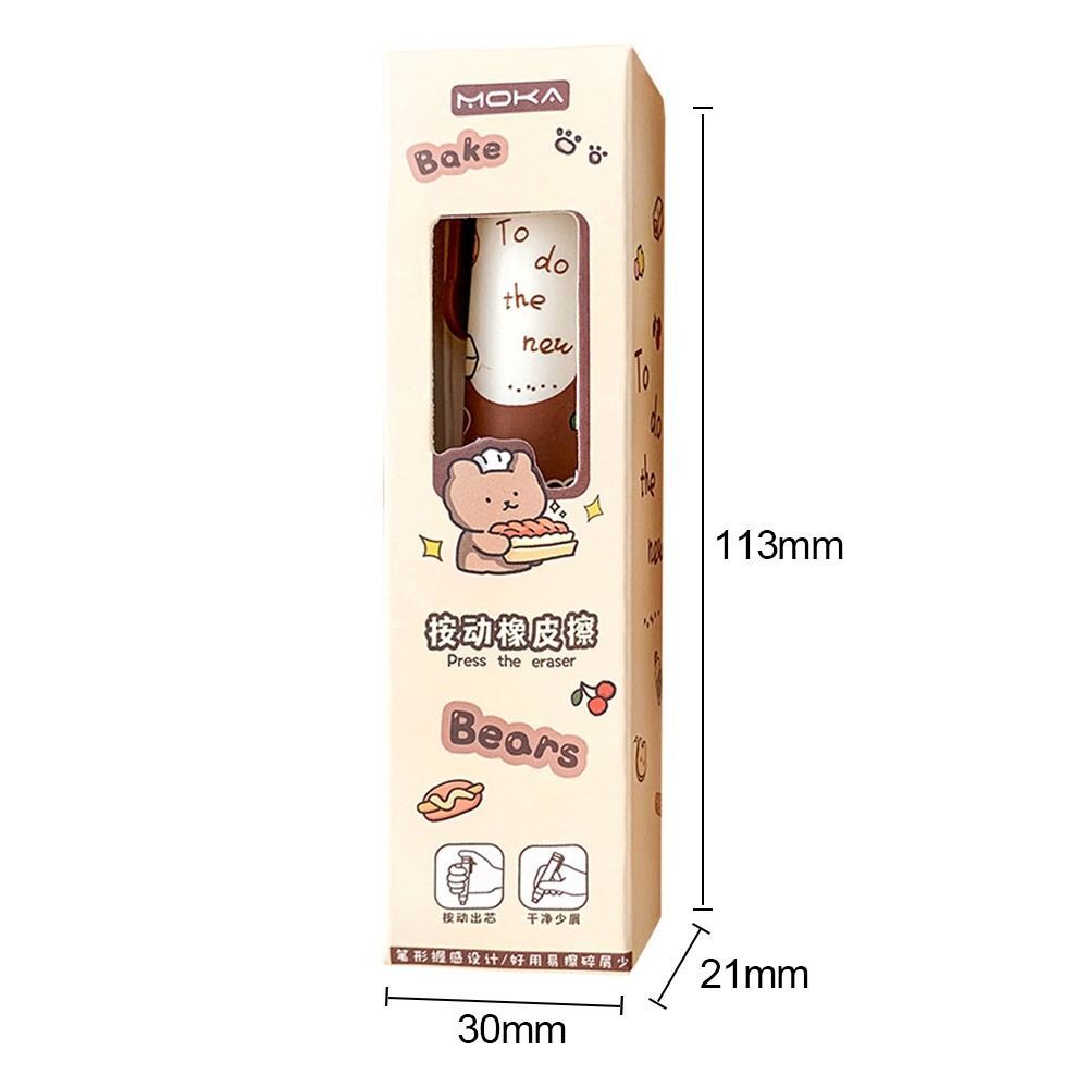 • Mechanism: They are press-type or retractable erasers, indicated by the text "Press the eraser" at the bottom left.