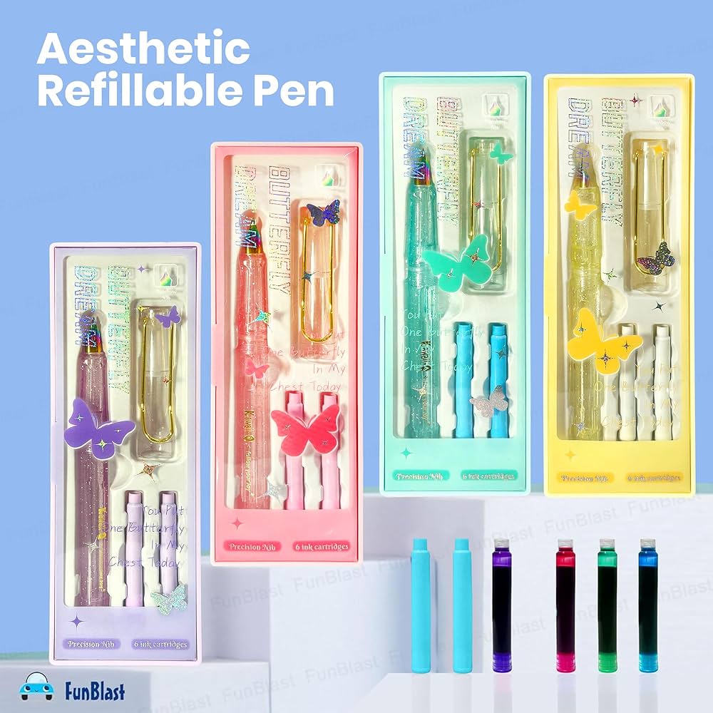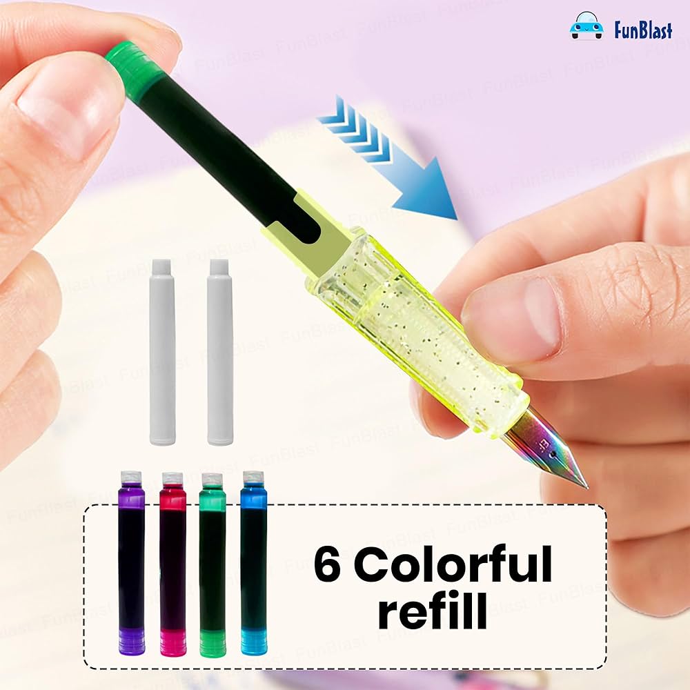 - Refillable & Eco-Friendly: Comes with 1 Fountain Pen with 6 refills with black & blue, Sky Blue, Green, Purple, Pink ink, reducing waste while ensuring long-lasting use.